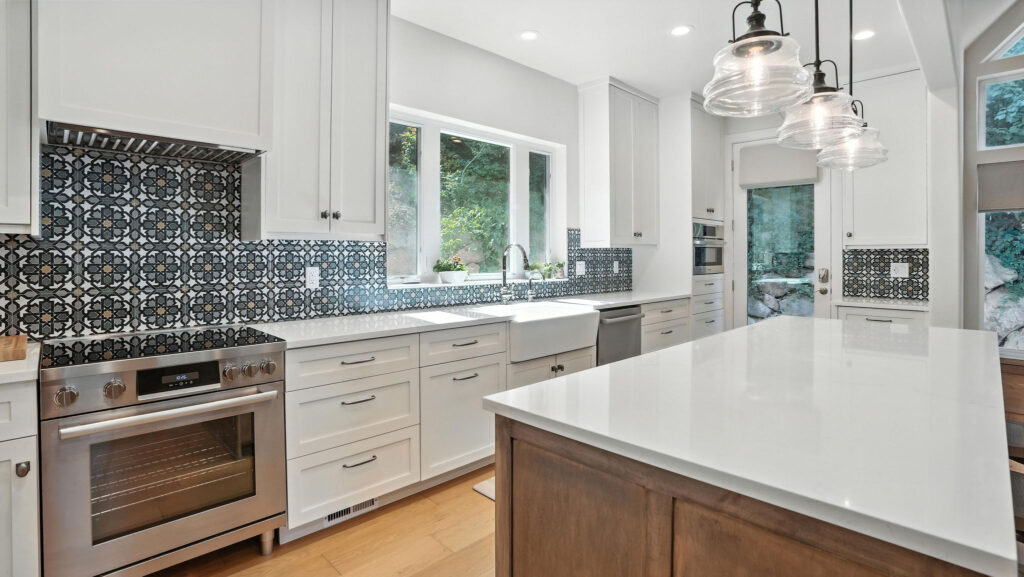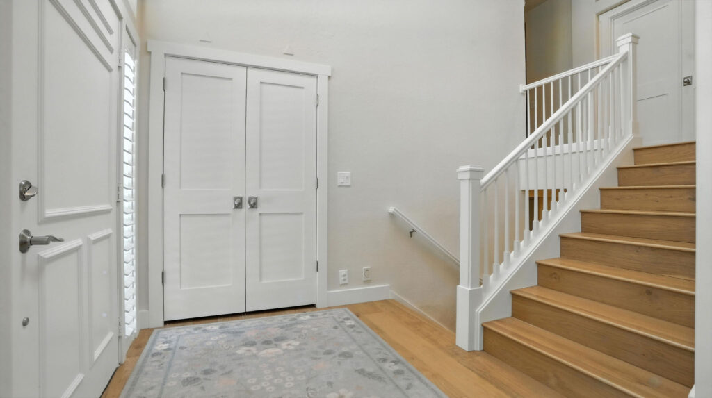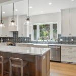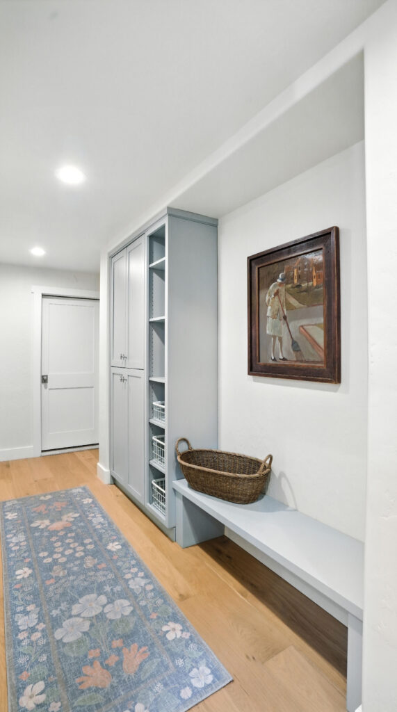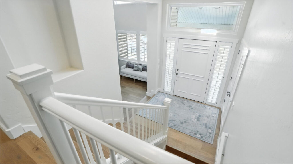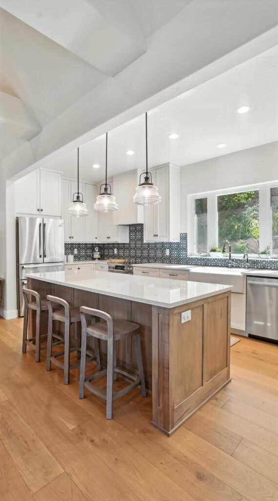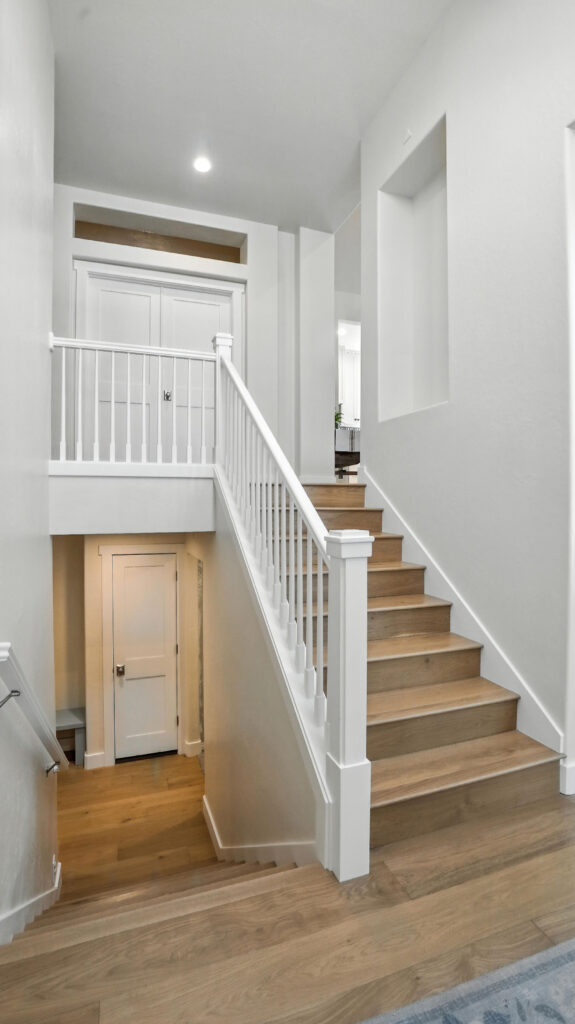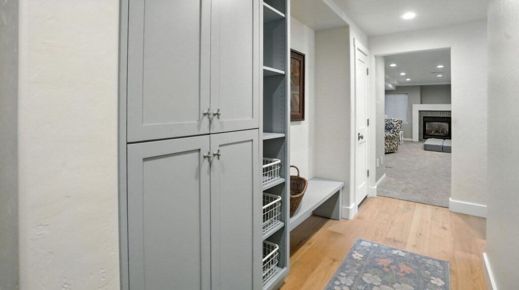 These images highlight the completed renovation and custom interior upgrades of a residence located at 1967 S 800 E in Bountiful, Utah, showcasing a bright, modern design combined with timeless craftsmanship. The newly remodeled kitchen features custom white cabinetry, quartz countertops, stainless steel appliances, and a large central island with warm wood accents that add contrast and character. Decorative patterned tile backsplashes and pendant lighting above the island provide a sophisticated focal point while maintaining a clean and functional cooking space. Additional images reveal beautifully integrated built-in shelving and cabinetry designed to maximize storage while maintaining a seamless architectural look throughout the home. The entryway and staircase area emphasize natural light, clean lines, and elegant white finishes that create an open and welcoming atmosphere. Altogether, the renovation reflects a thoughtful balance of modern functionality and classic design, transforming the home into a bright, organized, and stylish living environment.