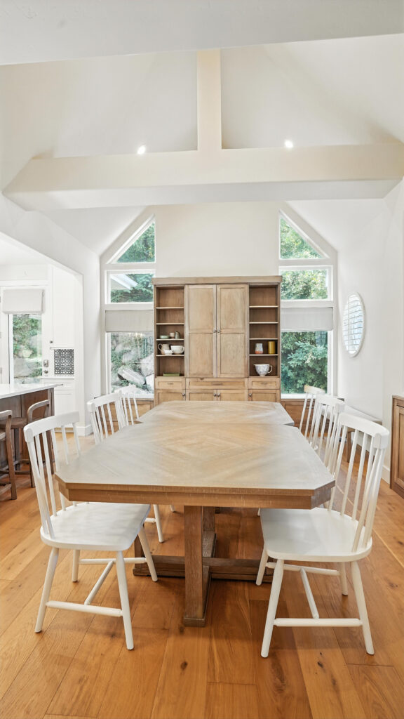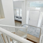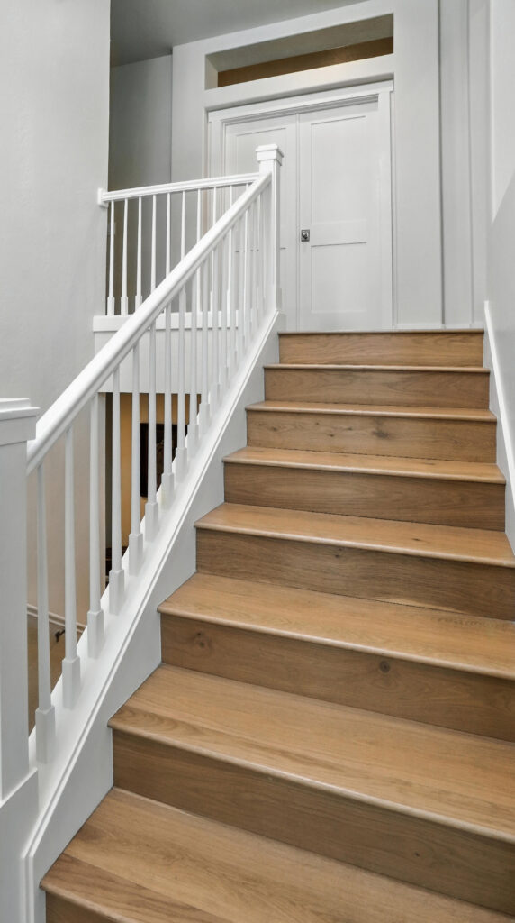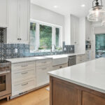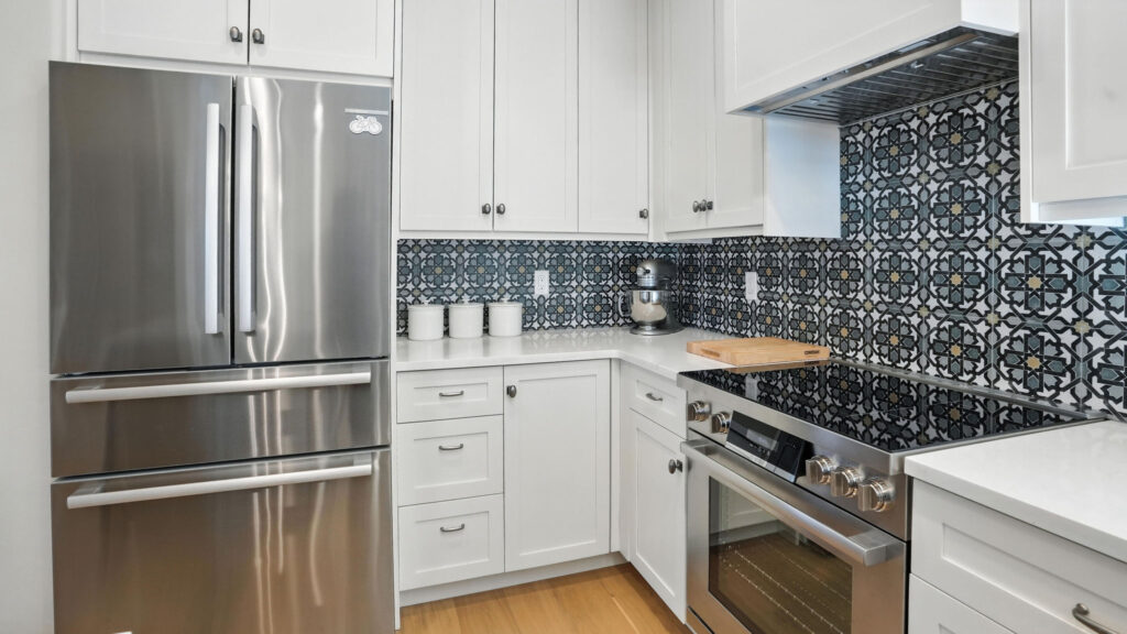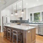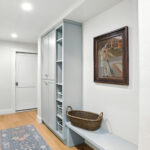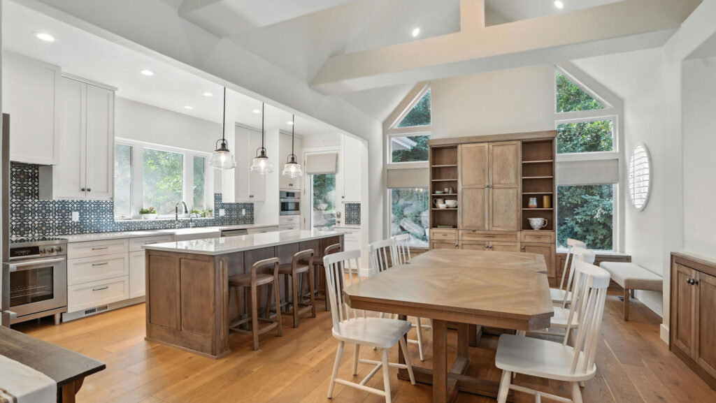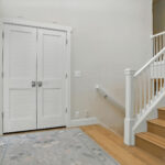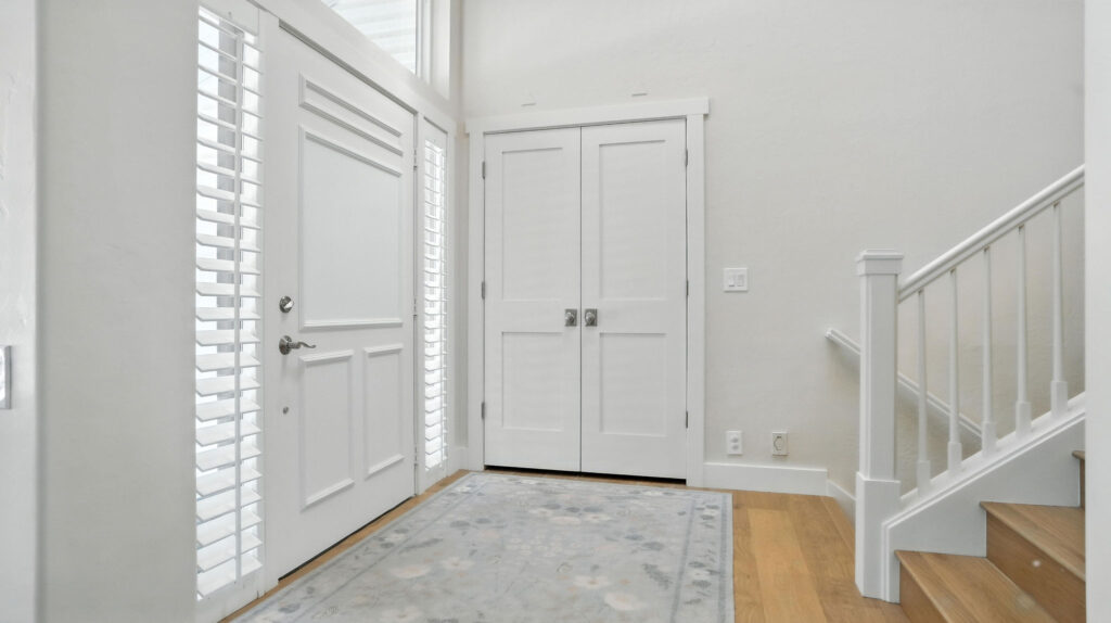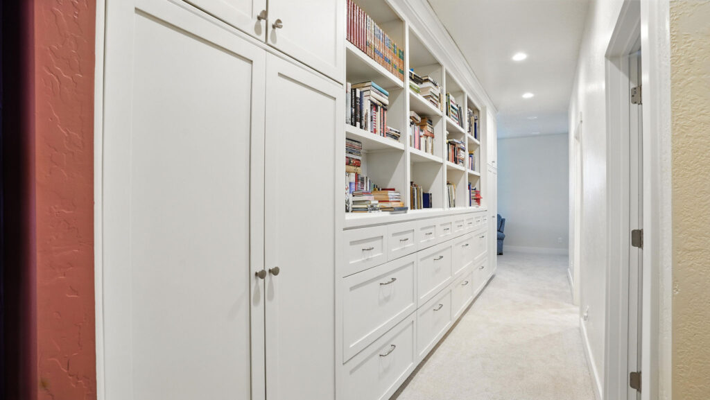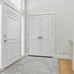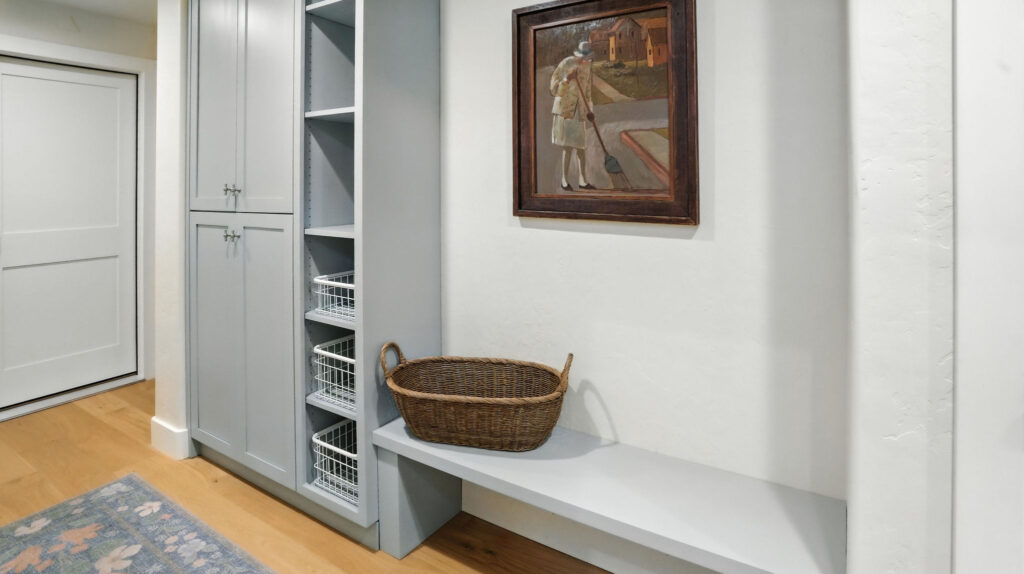 These images highlight the completed renovation and custom interior upgrades of a residence located at 1967 S 800 E in Bountiful, Utah, showcasing a bright, modern design combined with timeless craftsmanship. The newly remodeled kitchen features custom white cabinetry, quartz countertops, stainless steel appliances, and a large central island with warm wood accents that add contrast and character. Decorative patterned tile backsplashes and pendant lighting above the island provide a sophisticated focal point while maintaining a clean and functional cooking space. Additional images reveal beautifully integrated built-in shelving and cabinetry designed to maximize storage while maintaining a seamless architectural look throughout the home. The entryway and staircase area emphasize natural light, clean lines, and elegant white finishes that create an open and welcoming atmosphere. Altogether, the renovation reflects a thoughtful balance of modern functionality and classic design, transforming the home into a bright, organized, and stylish living environment.