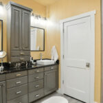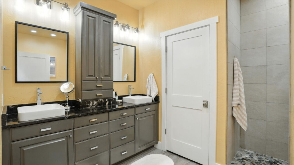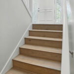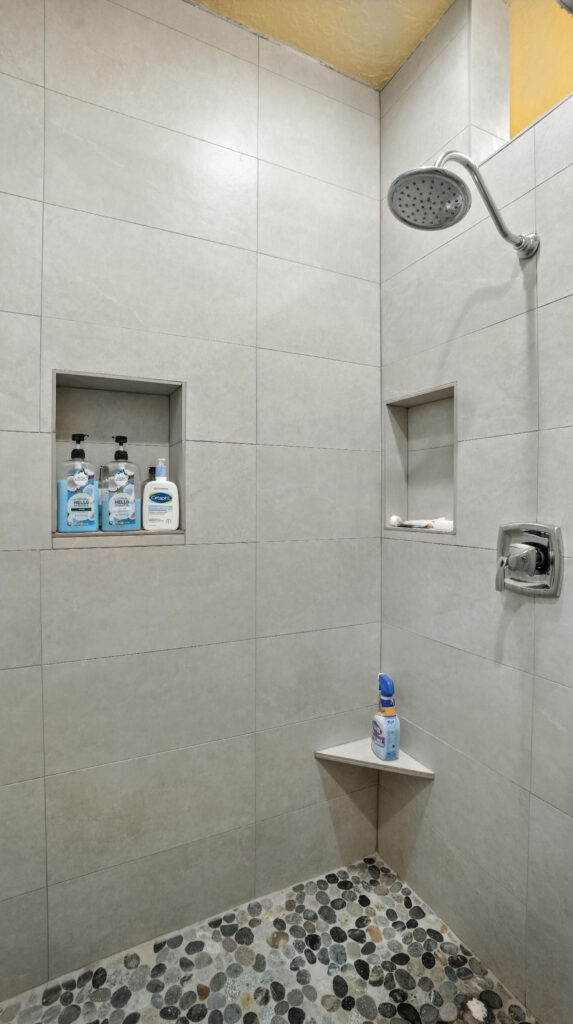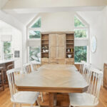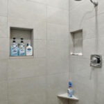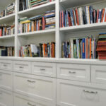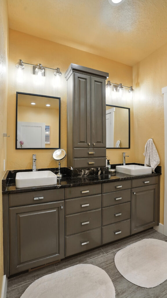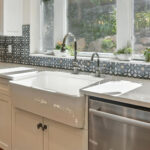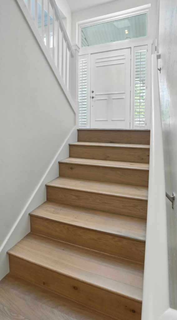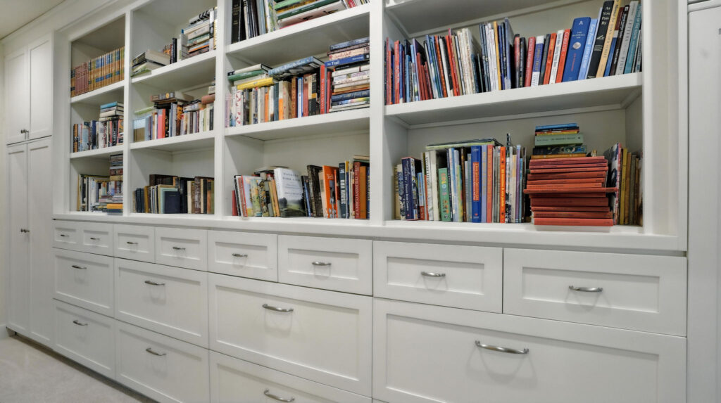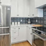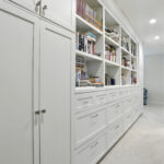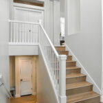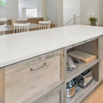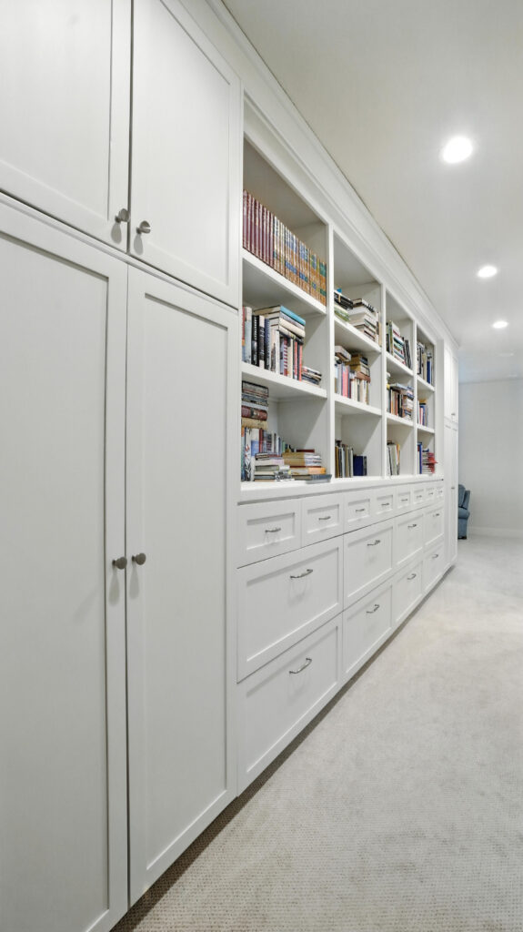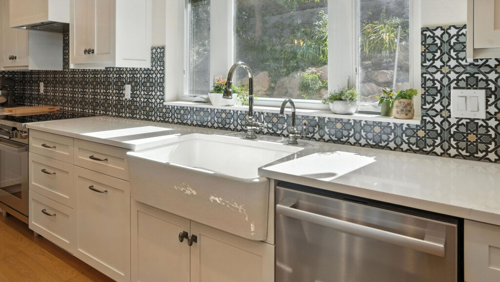 These images highlight the completed renovation and custom interior upgrades of a residence located at 1967 S 800 E in Bountiful, Utah, showcasing a bright, modern design combined with timeless craftsmanship. The newly remodeled kitchen features custom white cabinetry, quartz countertops, stainless steel appliances, and a large central island with warm wood accents that add contrast and character. Decorative patterned tile backsplashes and pendant lighting above the island provide a sophisticated focal point while maintaining a clean and functional cooking space. Additional images reveal beautifully integrated built-in shelving and cabinetry designed to maximize storage while maintaining a seamless architectural look throughout the home. The entryway and staircase area emphasize natural light, clean lines, and elegant white finishes that create an open and welcoming atmosphere. Altogether, the renovation reflects a thoughtful balance of modern functionality and classic design, transforming the home into a bright, organized, and stylish living environment.